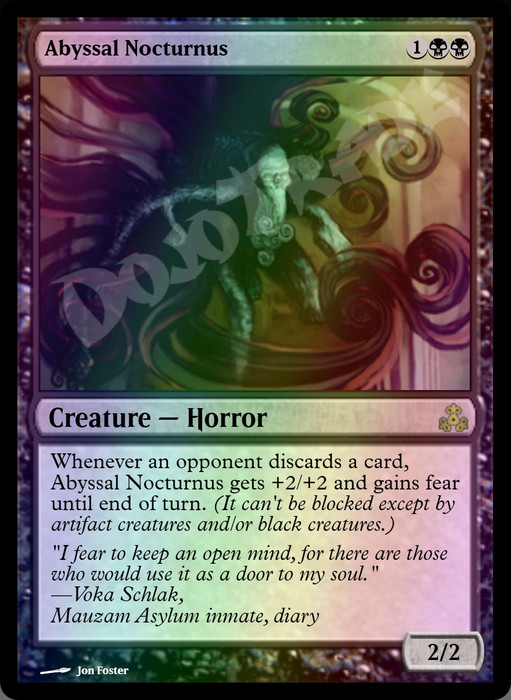 Whenever an opponent discards a card, this creature gets +2/+2 and gains fear until end of turn. (It can't be blocked except by artifact creatures and/or black creatures.)
