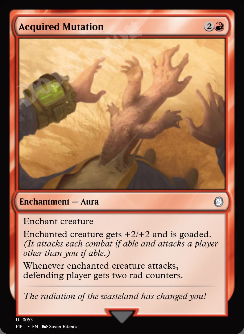 Whenever enchanted creature attacks, defending player gets two rad counters.