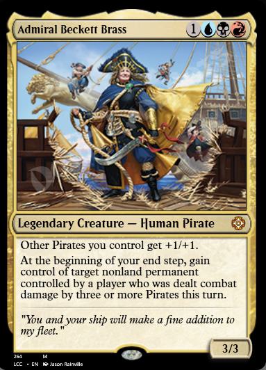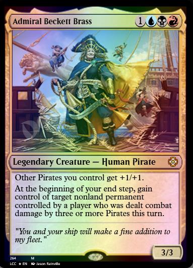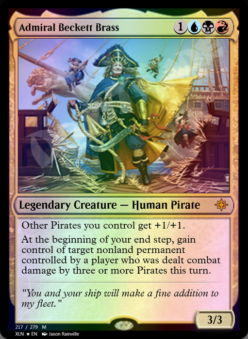 At the beginning of your end step, gain control of target nonland permanent controlled by a player who was dealt combat damage by three or more Pirates this turn.