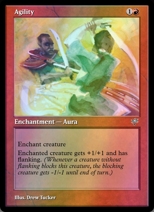 Enchant creatureEnchanted creature gets +1/+1 and has flanking. (Whenever a creature without flanking blocks this creature, the blocking creature gets -1/-1 until end of turn.)