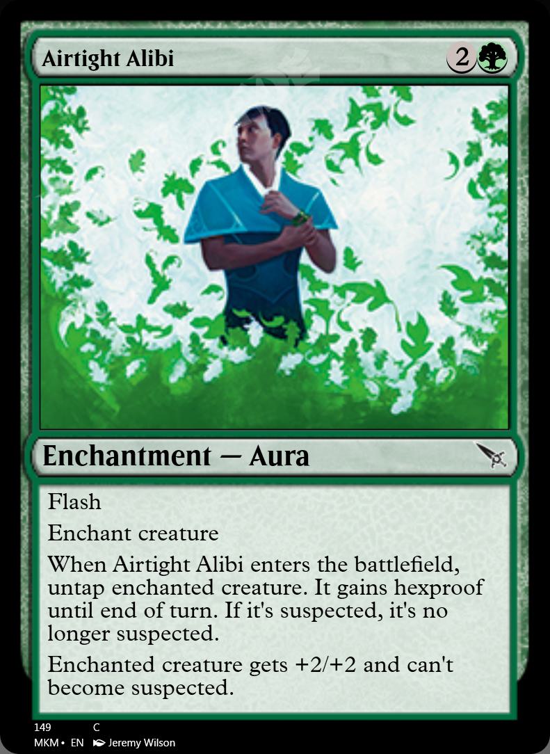 When this Aura enters, untap enchanted creature. It gains hexproof until end of turn. If it's suspected, it's no longer suspected.