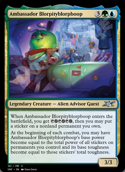 At the beginning of each combat, you may have Ambassador Blorpityblorpboop's base power become equal to the total power of all stickers on permanents you control and its base toughness become equal to those stickers' total toughness.