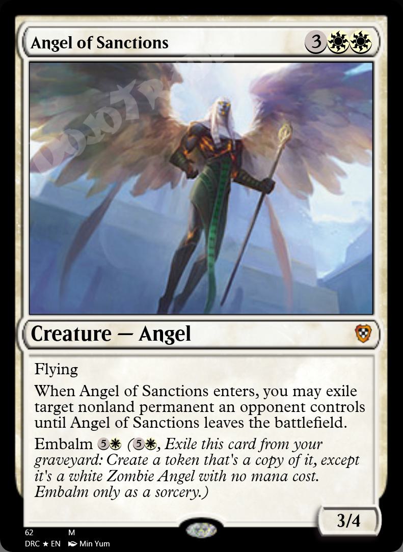 , Exile this card from your graveyard: Create a token that's a copy of it, except it's a white Zombie Angel with no mana cost. Embalm only as a sorcery.)
