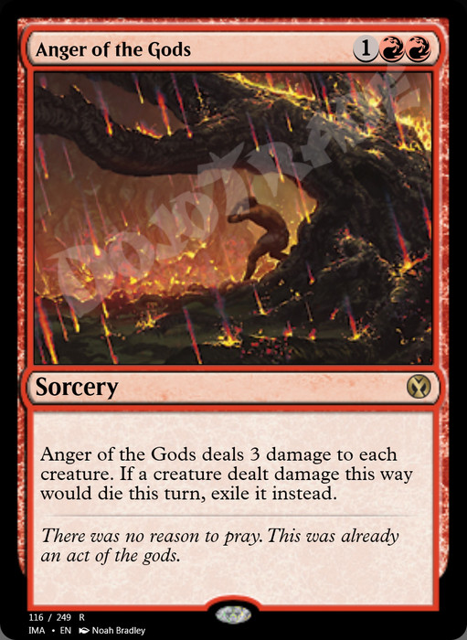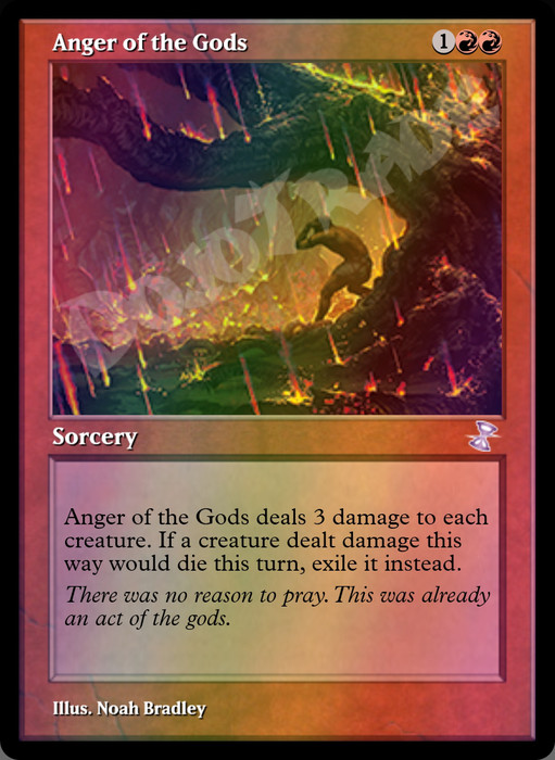 Anger of the Gods deals 3 damage to each creature. If a creature dealt damage this way would die this turn, exile it instead.