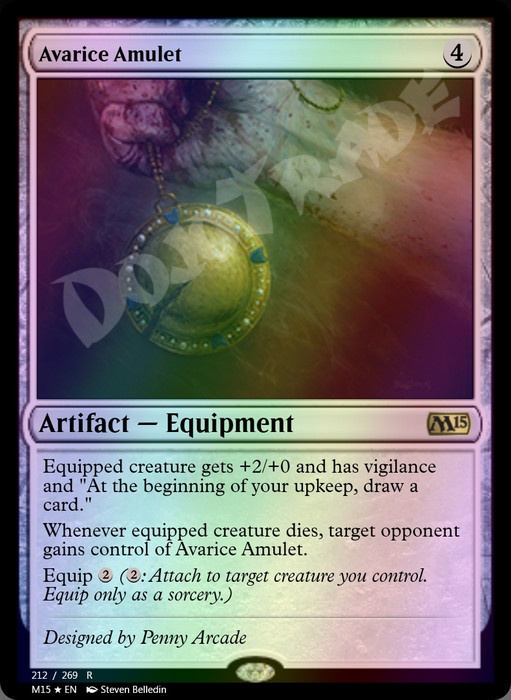 Whenever equipped creature dies, target opponent gains control of this Equipment.