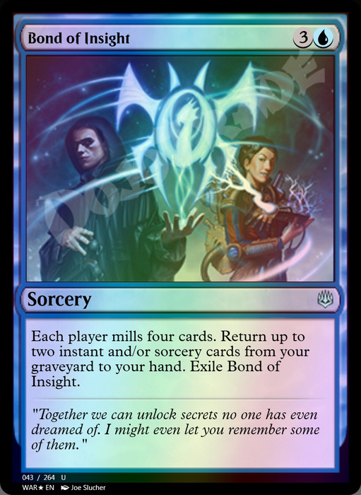 Each player mills four cards. Return up to two instant and/or sorcery cards from your graveyard to your hand. Exile Bond of Insight.