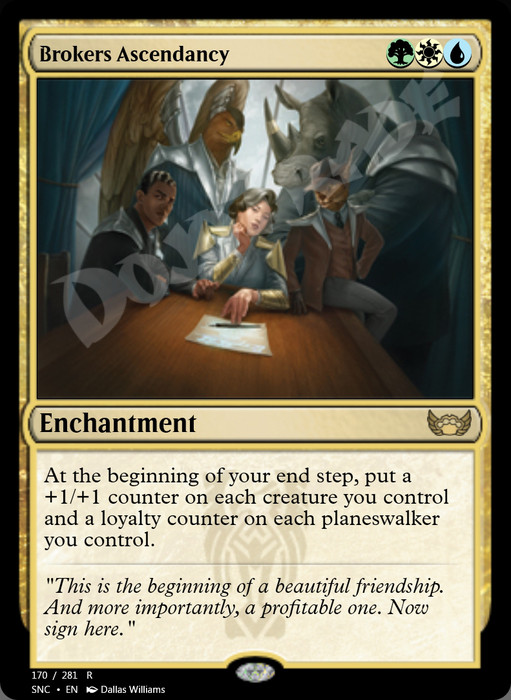 At the beginning of your end step, put a +1/+1 counter on each creature you control and a loyalty counter on each planeswalker you control.