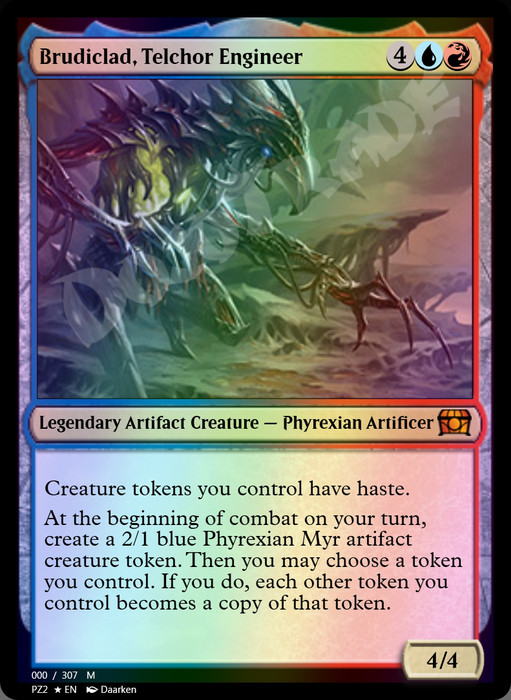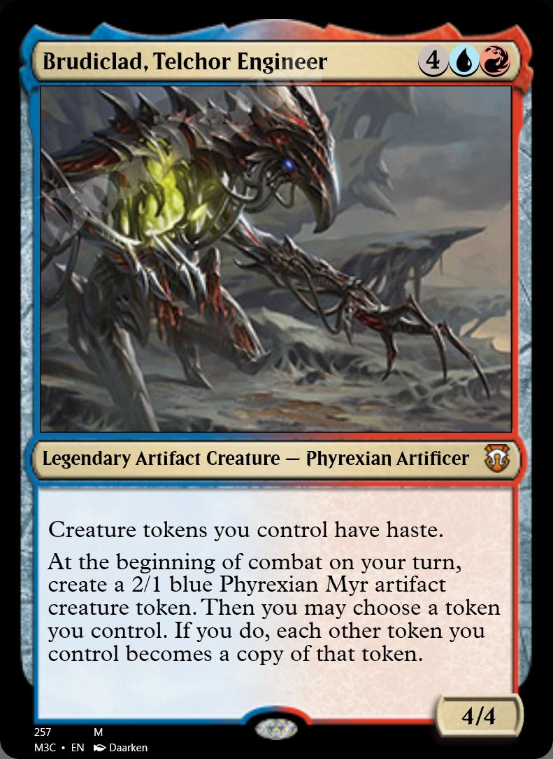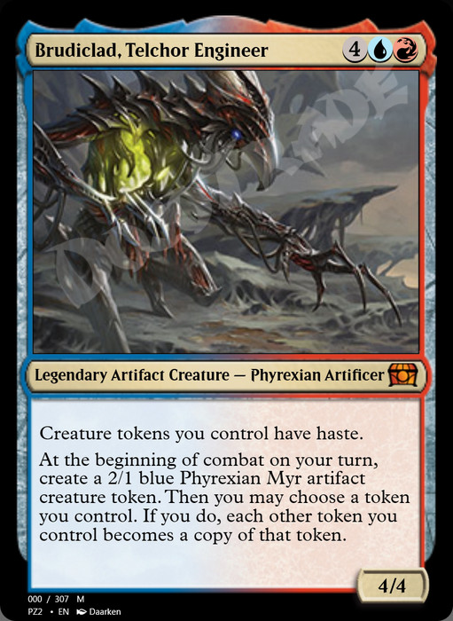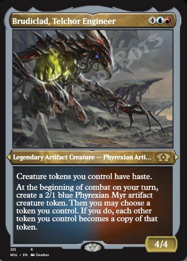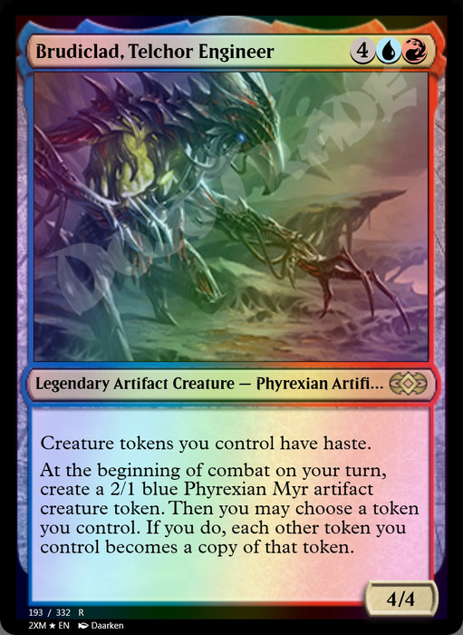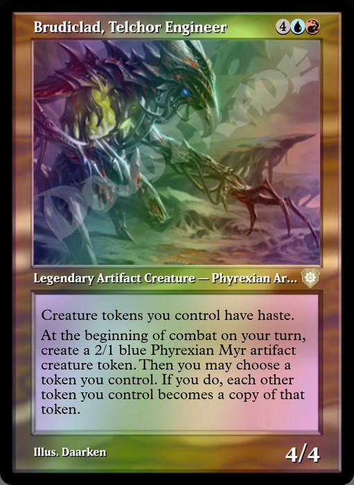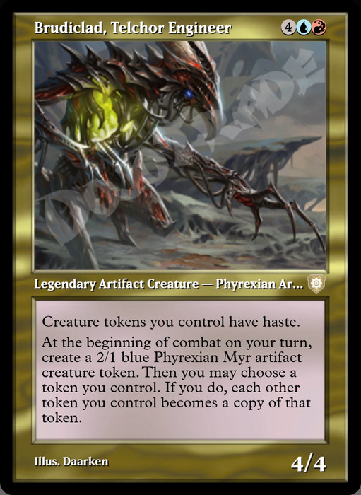 At the beginning of combat on your turn, create a 2/1 blue Phyrexian Myr artifact creature token. Then you may choose a token you control. If you do, each other token you control becomes a copy of that token.