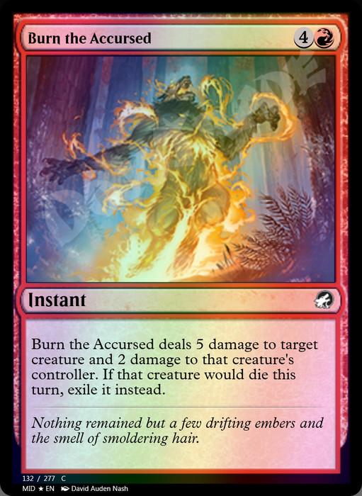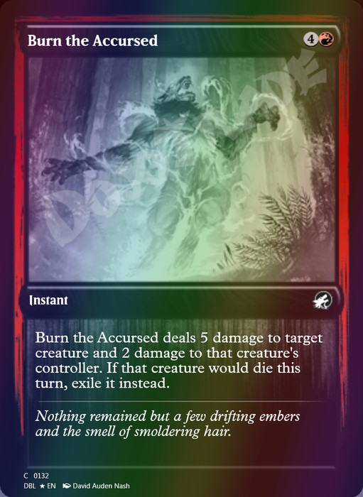 Burn the Accursed deals 5 damage to target creature and 2 damage to that creature's controller. If that creature would die this turn, exile it instead.
