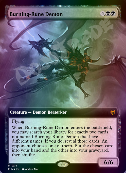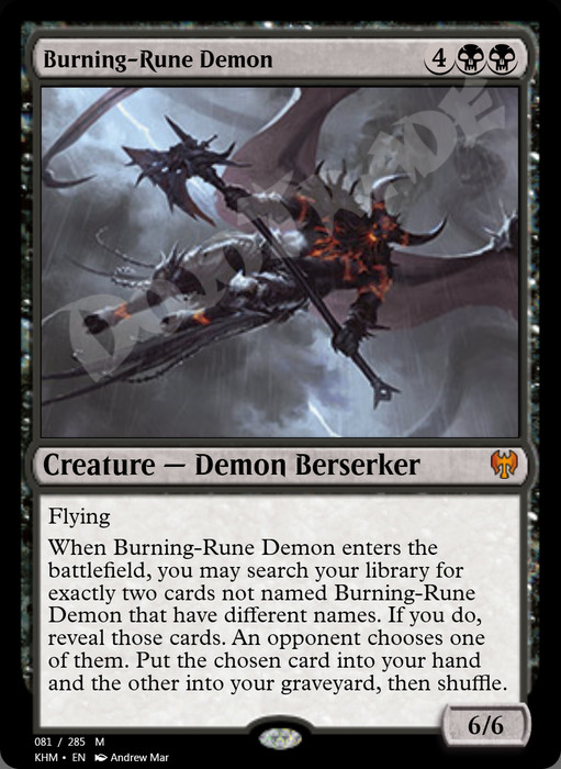 When this creature enters, you may search your library for exactly two cards not named Burning-Rune Demon that have different names. If you do, reveal those cards. An opponent chooses one of them. Put the chosen card into your hand and the other into your graveyard, then shuffle.