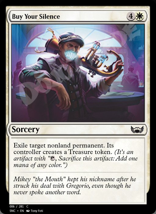 Exile target nonland permanent. Its controller creates a Treasure token. (It's an artifact with " , Sacrifice this token: Add one mana of any color.")