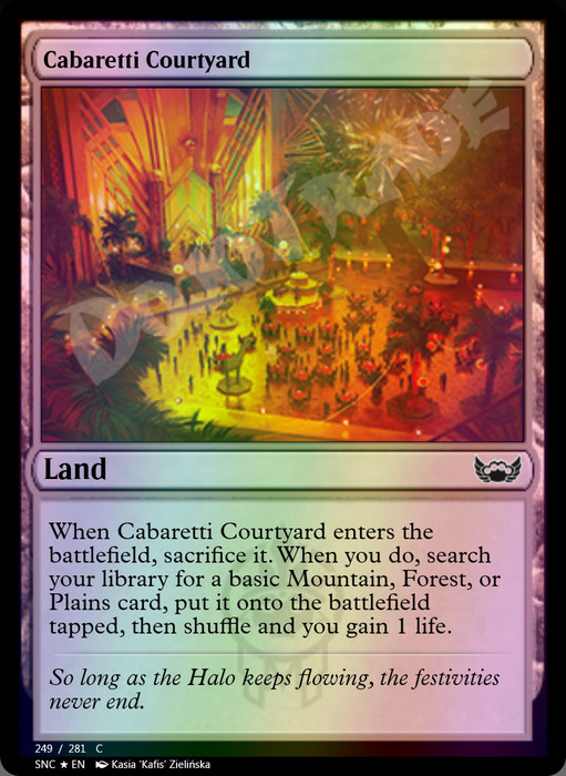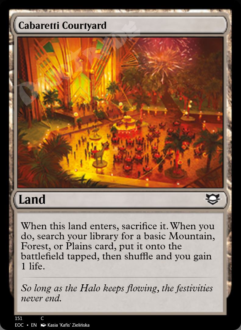When this land enters, sacrifice it. When you do, search your library for a basic Mountain, Forest, or Plains card, put it onto the battlefield tapped, then shuffle and you gain 1 life.