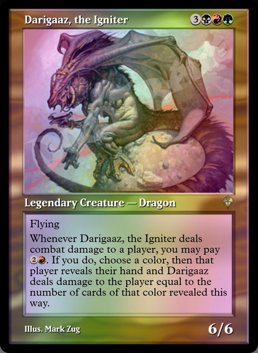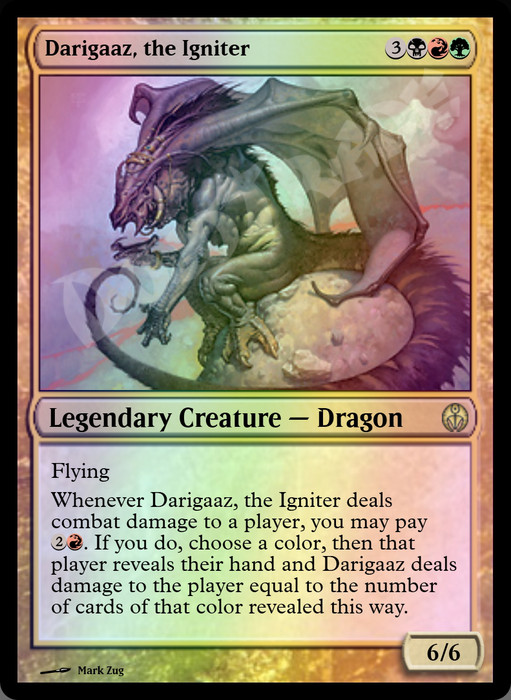 . If you do, choose a color, then that player reveals their hand and Darigaaz deals damage to the player equal to the number of cards of that color revealed this way.