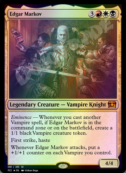Eminence — Whenever you cast another Vampire spell, if Edgar is in the command zone or on the battlefield, create a 1/1 black Vampire creature token.