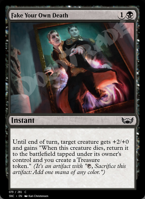 Until end of turn, target creature gets +2/+0 and gains "When this creature dies, return it to the battlefield tapped under its owner's control and you create a Treasure token." (It's an artifact with " , Sacrifice this token: Add one mana of any color.")