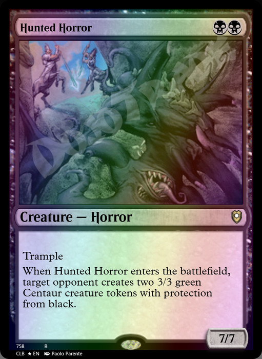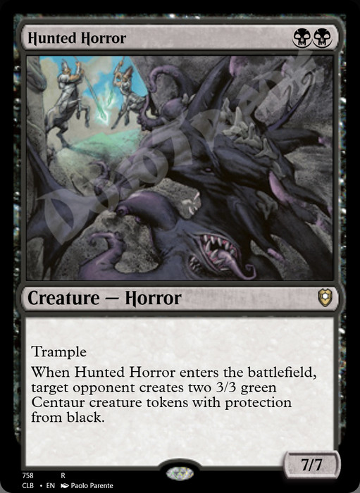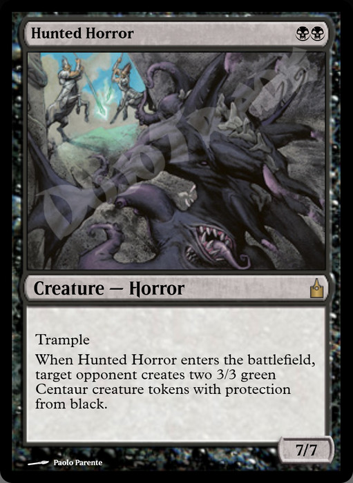 When this creature enters, target opponent creates two 3/3 green Centaur creature tokens with protection from black.