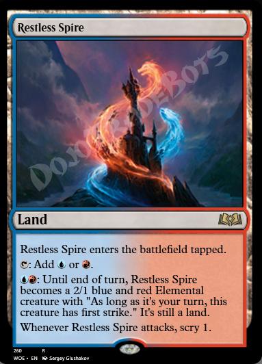 This land enters tapped. : Add or . : Until end of turn, this land becomes a 2/1 blue and red Elemental creature with "During your turn, this creature has first strike." It's still a land.Whenever this land attacks, scry 1.