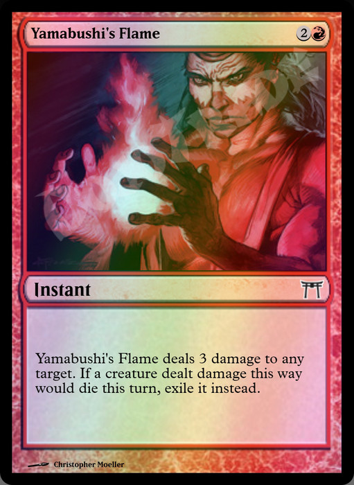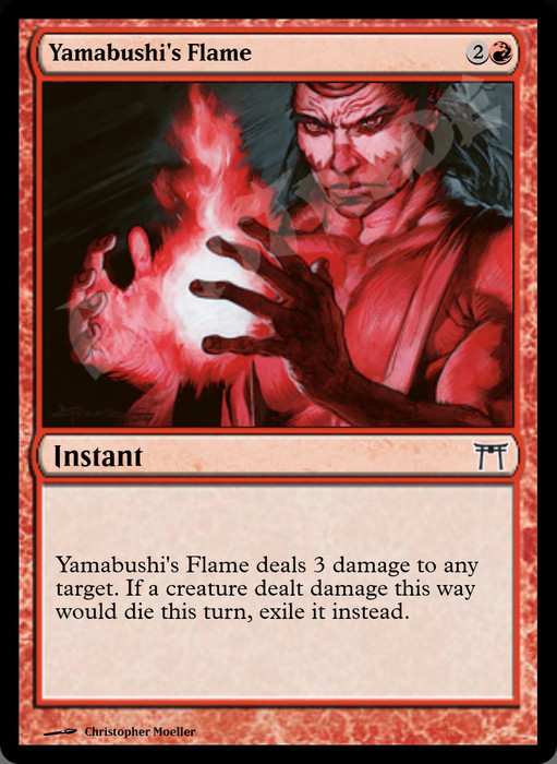 Yamabushi's Flame deals 3 damage to any target. If a creature dealt damage this way would die this turn, exile it instead.